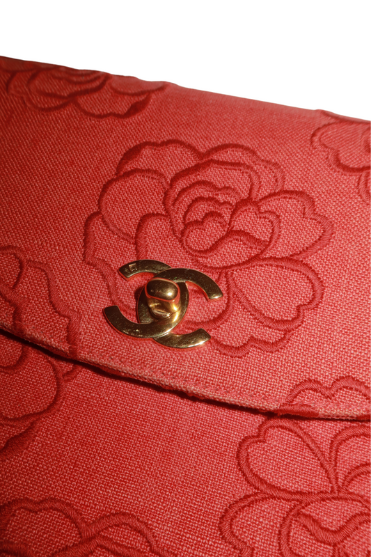 CHANEL Canvas Camellia Embroidered Double Flap Bag