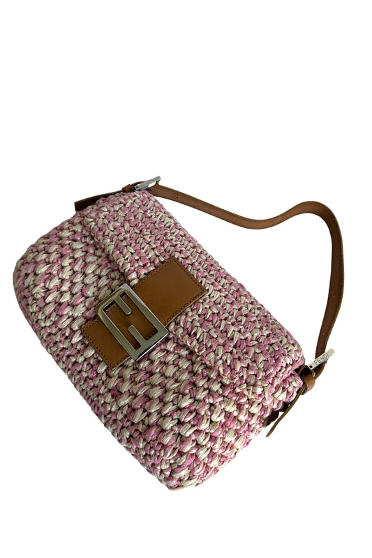FENDI Raffia Straw Crochet Baguette Bag Pink x Cream