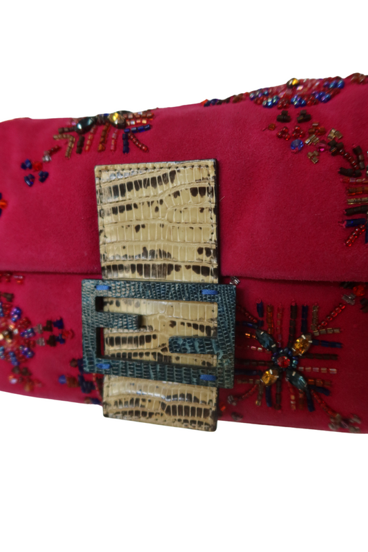 RARE FENDI Fuchsia Beaded Baguette with Lizard Leather Trim